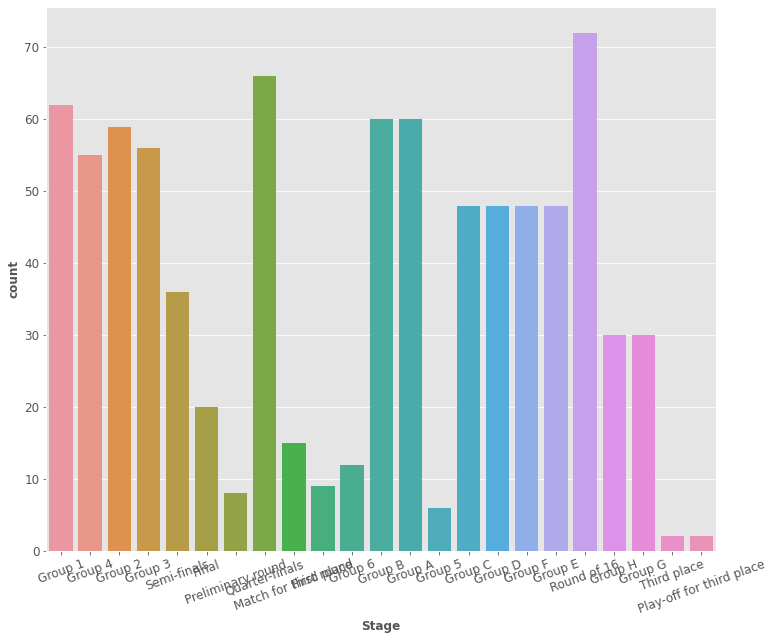 우리가 탐구할 수 있는 또 다른 멋진 것은 경기 데이터 세트에서 우리는 토너먼트의 무대도 가지고 있다는 사실과 관련이 있다. 한 나라가 조별리그를 통과한 횟수는 분명히 그 팀의 자질을 나타내는 것이기 때문에 그것을 탐구하는 걸 한 번 봅시다.