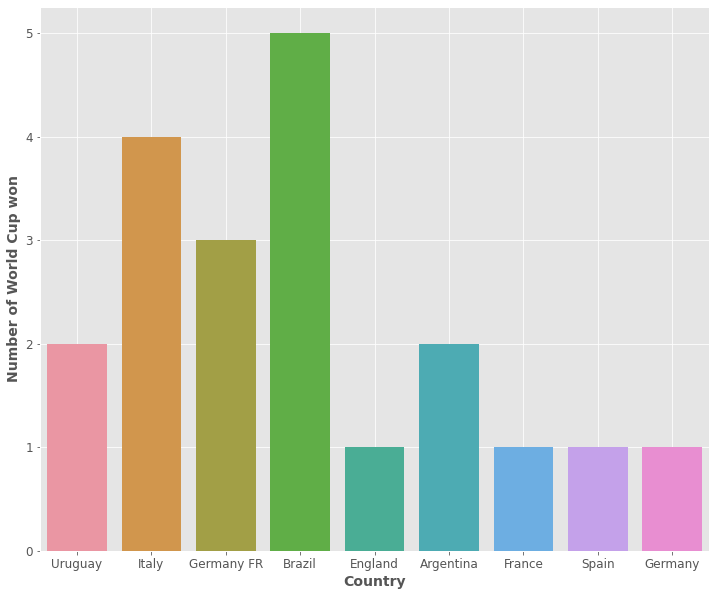 sns.countplot(data_winner.Winner) plt.grid(True) plt.ylabel('Number of World Cup won',fontsize=14) plt.xlabel('Country',fontsize=14)