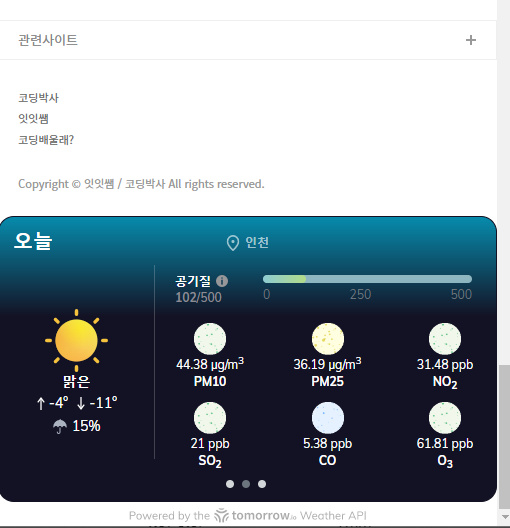 저는 대기실내질과, 날씨를 동시에 보여주고 싶어서, 이렇게 블로그 하단에 삽입하였는데요.