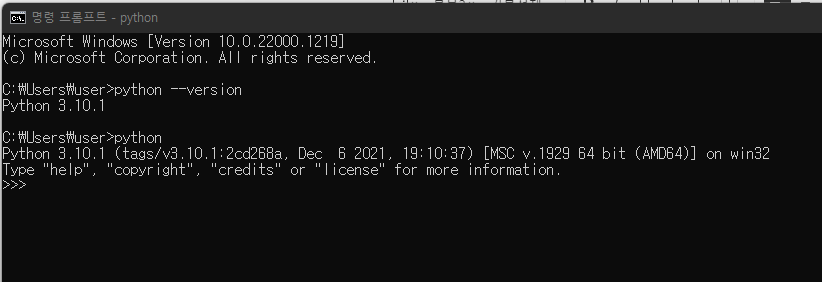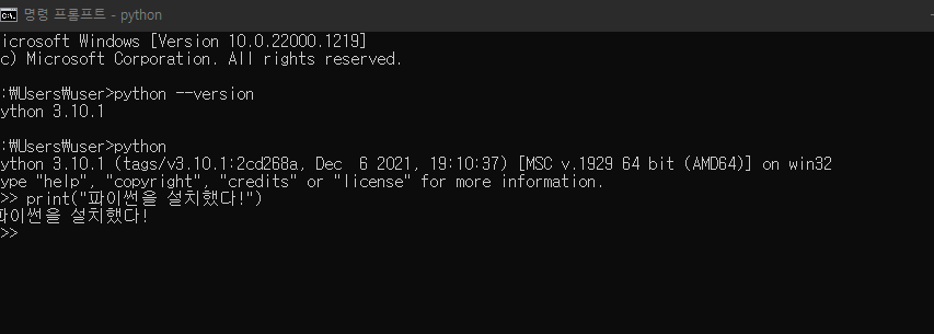 자 그럼, 파이썬을 실행하려면 python 혹은 py 를 입력하시기 바랍니다.
