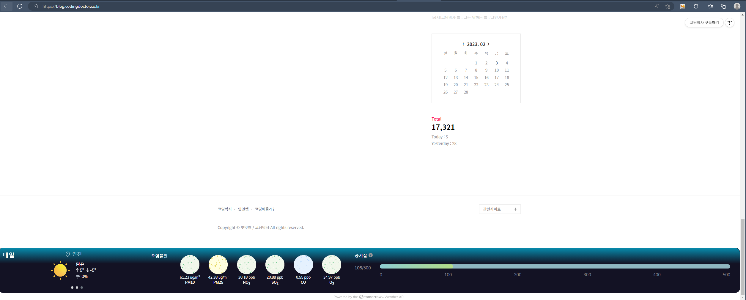 코딩박사 블로그 에서는 하단과 상단에 미세먼지와 날씨를 위젯으로 제공하고 있습니다.