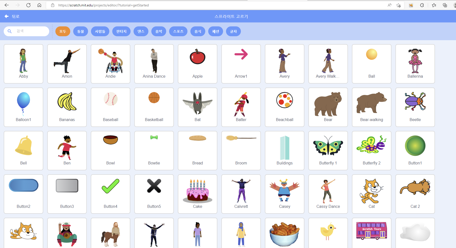 다음과 같이 파란색 동그라미를 선택하면, 저렇게 스프라이트를 선택하는 화면이 나옵니다.