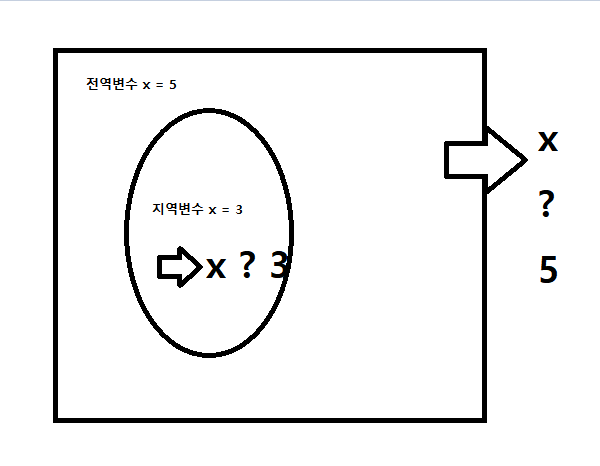 원 안에는 지역변수 x=3이 나올 거예요, 지역변수가 선언이 안된다면, 바로 x=5가 나오겠죠!
