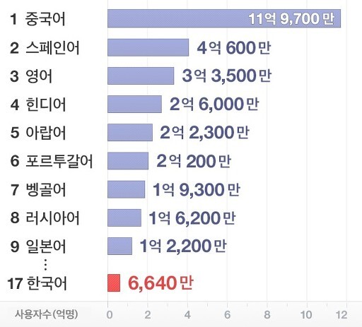 마찬가지로, 중국어 사람들이 많이 있기때문에, 중국어가 사용률 1위이듯이,